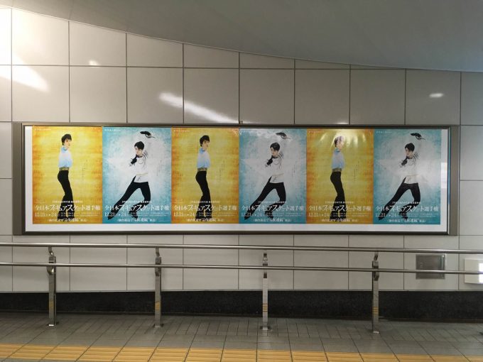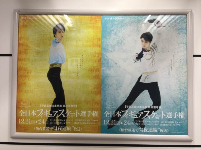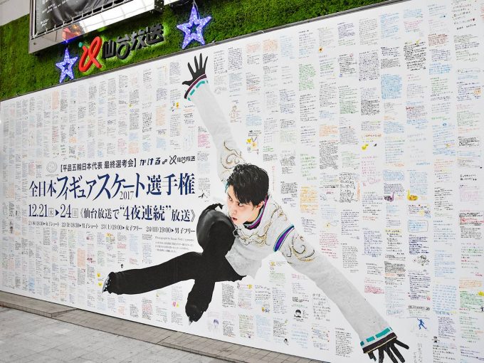 12月21日に始まる「全日本フィギュアスケート選手権 2017」の応援プロモーションとして、仙台放送が企画した同ポスター。同スペースのクリスロード商店街側ガラス面に、縦=約3メートル、横=約7メートルのラッピングを施した。
