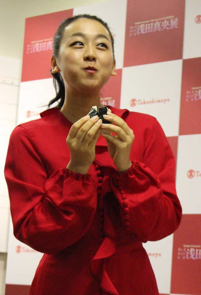 同展開催に合わせて考案した新潟米コシヒカリで作るおむすび「まおむすび」の新メニューも披露。「関西の人は炭水化物と炭水化物をよく食べる」と、醤油味のたこ焼きを具材にしたおむすびをほおばり、「バッチリです」とアピールした。現役引退後、「食べる事大好きなので、食べ過ぎちゃいます」と告白した。ご当地おむすびは同展期間中、各地で販売される。