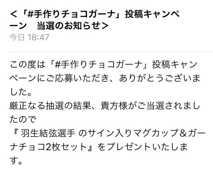 羽生結弦選手のサイン入りマグカップ当選のお知らせメールが続々到着。当たった人が羨ましい。