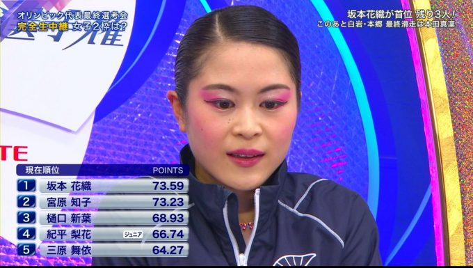 フィギュアスケートの全日本選手権は21日、女子ショートプログラム(SP)が行われ、坂本花織(シスメックス)がシーズンベストの73.59点で首位。大会3連覇中の宮原知子(関大)は73.23点で2位、本郷理華(邦和スポーツランド)が70.48点で3位。樋口新葉(日本橋女学館高)は68.93点で4位、最終滑走の本田真凜(関大高)は66.65点で6位だった。先のジュニアグランプリ(GP)ファイナルで国際スケート連盟(ISU)公認大会で女子史上初のトリプルアクセル(3回転半)-3回転トーループの連続ジャンプを成功させた紀平梨花(関大KFSC)は66.74点で5位に入っている。