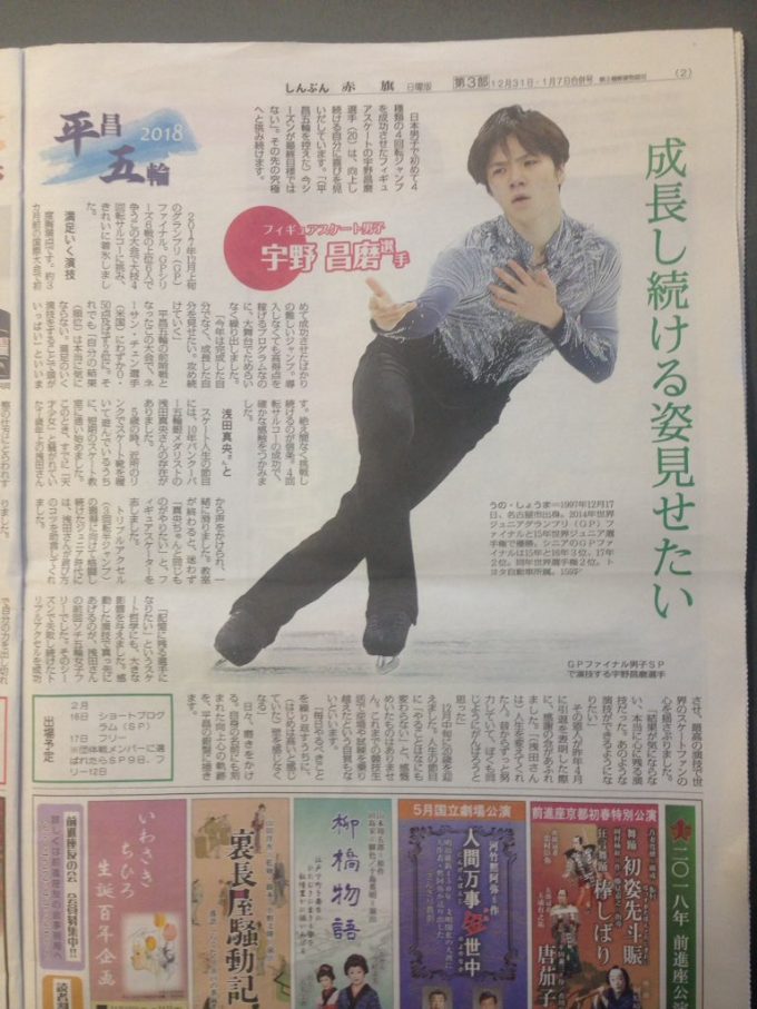 発売中の「フィギュアスケート日本男子ファンブック Quadruple2018」で、少し前に僕が撮影した宇野昌磨選手の写真を大きく使って頂いておりますー!よろしくどうぞー。なお、四大陸選手権に行くか現在検討中。。。