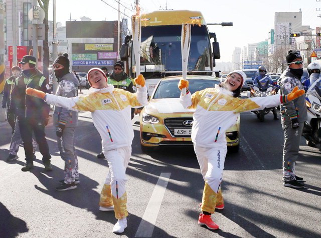 厳しい冷え込みの中で先頭を切った荒川さんは沿道に手を振り「初めての経験で平昌五輪がまた楽しみになった」と話した。荒川さんから聖火を引き継いだ高橋さんは一緒にフィギュアのポーズを取り「トーチが重かったけど楽しかった。光栄だった」と大喜び。14年ソチ五輪後に現役を退いた上村さんは「五輪に関われてうれしい」と笑い、途中ではモーグルのエア(空中技)のポーズも披露した。