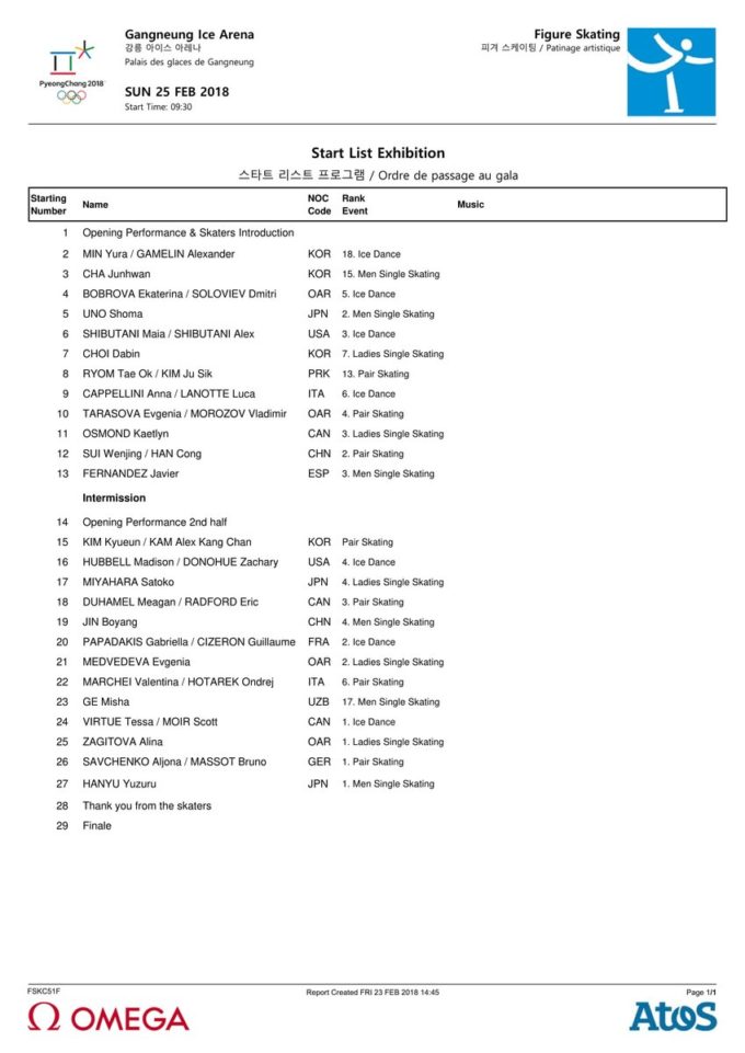なおエキシビションには男女のシングル、アイスダンス、ペアの上位者、開催国・韓国の選手、主催者推薦の選手ら25組が出場する。