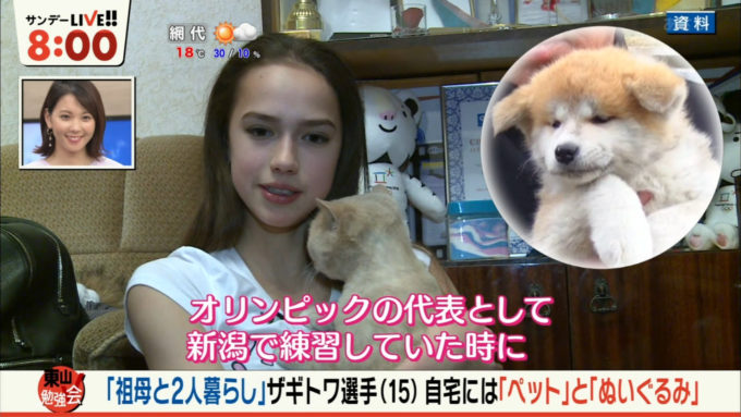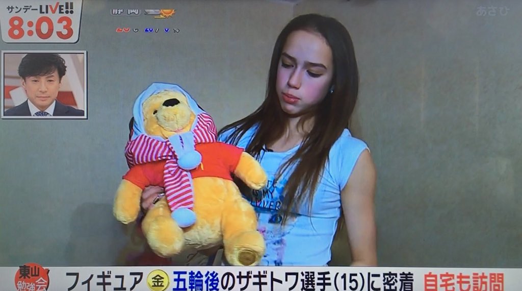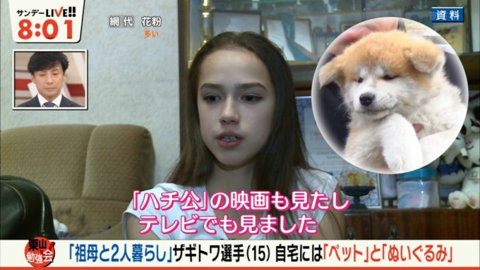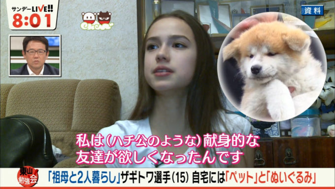 ザギトワ選手の一日密着で、祖母宅が1DKであることが判明し、秋田犬飼えるのか大丈夫か…と思いつつ(リンク脇に小屋建てるという話もどっかで)、羽生選手から貰ったプーさんとか、両親と一緒にモスクワで暮らせるかも…という言葉に、皆で暮らせるといいねぇ(泣)となった