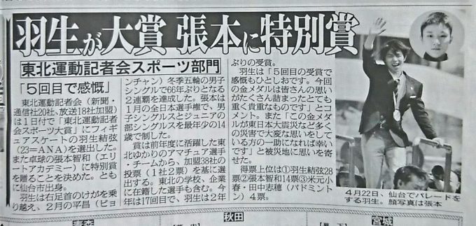 「東北運動記者会スポーツ大賞」羽生選手、張本選手、おめでとうございます\(^o^)/