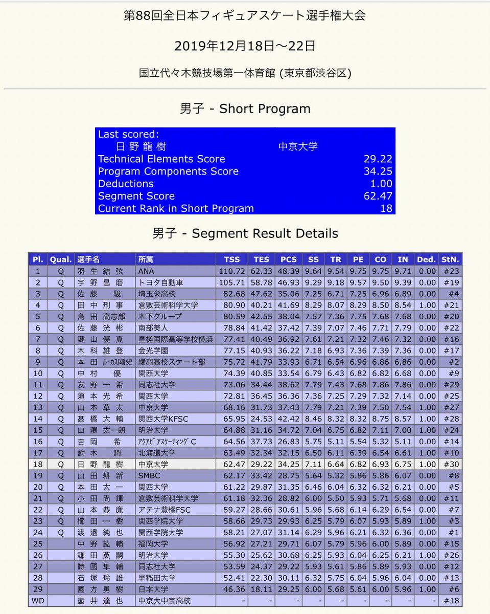 フィギュアスケートの全日本選手権は、男子シングル前半のショートプログラムが行われ、4年ぶりに出場の羽生結弦選手は4回転と3回転の連続ジャンプなど3つのジャンプを着氷し、トップに立ちました。 www3.nhk.or.jp/news/html/2019…