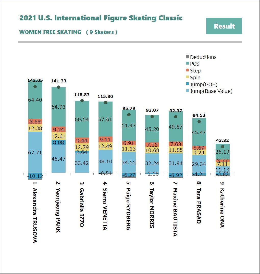 Sportsru「トゥルソワがミスにも関わらずUS International Classicで勝利。4Fで転倒、次に4S、2A-3Tをミスなく実施。4Tはパンクし2Tに、後に4Lzを飛ぶも手が氷に触れ回転不足。4Lz-Eu-3Sは3Sが回転不足。最後の3Lz-3Tはミスなし。142.05点を獲得しFS1位、総合216.80点で1位」