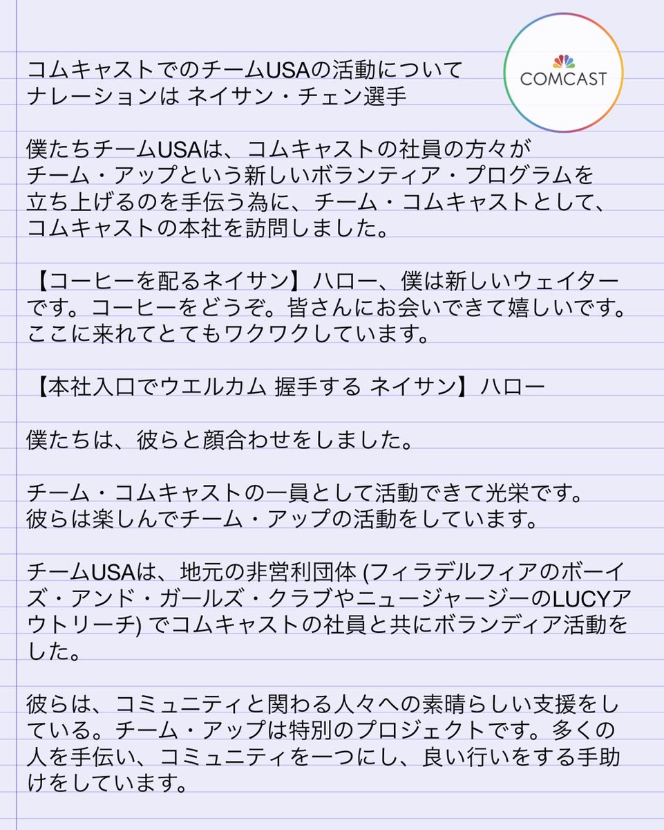 ネイサン「僕たちチームUSAは コムキャストの社員の方々が…新しいボランティア・プログラムを立ち上げるのを手伝う為に…コムキャスト本社を訪問しました」