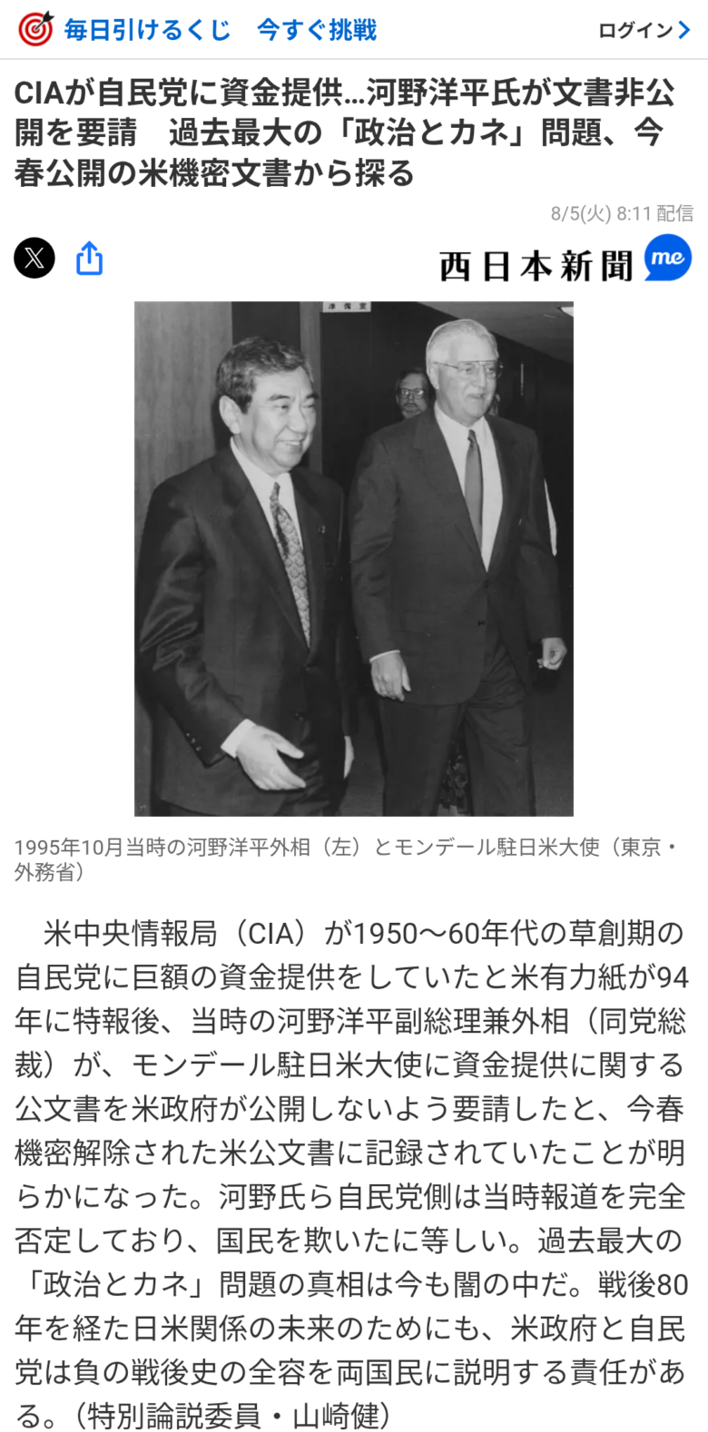 CIAが自民党に巨額の資金援助してたことも94年に公開されたけど、当時の自民党河野洋平が必死に隠蔽工作していた事もバレた