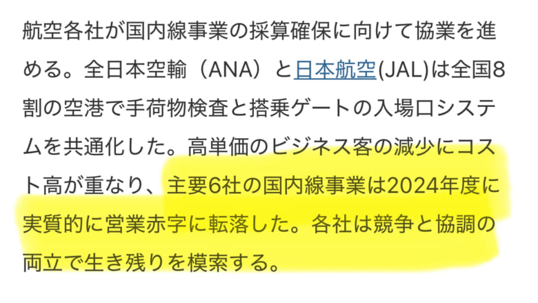 ANAやJALなどの航空会社が国内線で赤字だって。