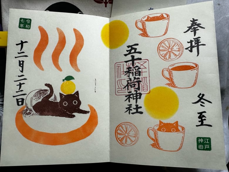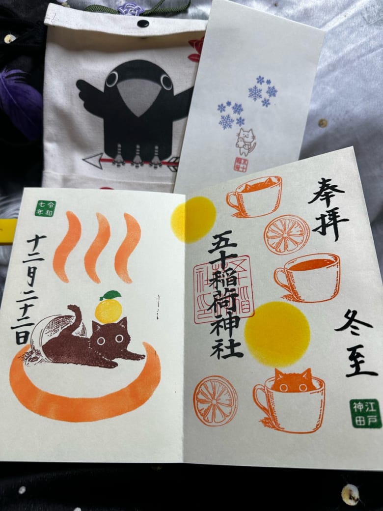• 五十稲荷神社の「冬至御朱印」が可愛すぎて氷上スレ民が3時間待ちの大行列www「黒にゃんこ最強」「挟み紙まで凝ってる」と絶賛の嵐!背後に映り込む“弓弦羽神社”の袋に「安定のガチ勢w」と推し活の絆にホッコリ!