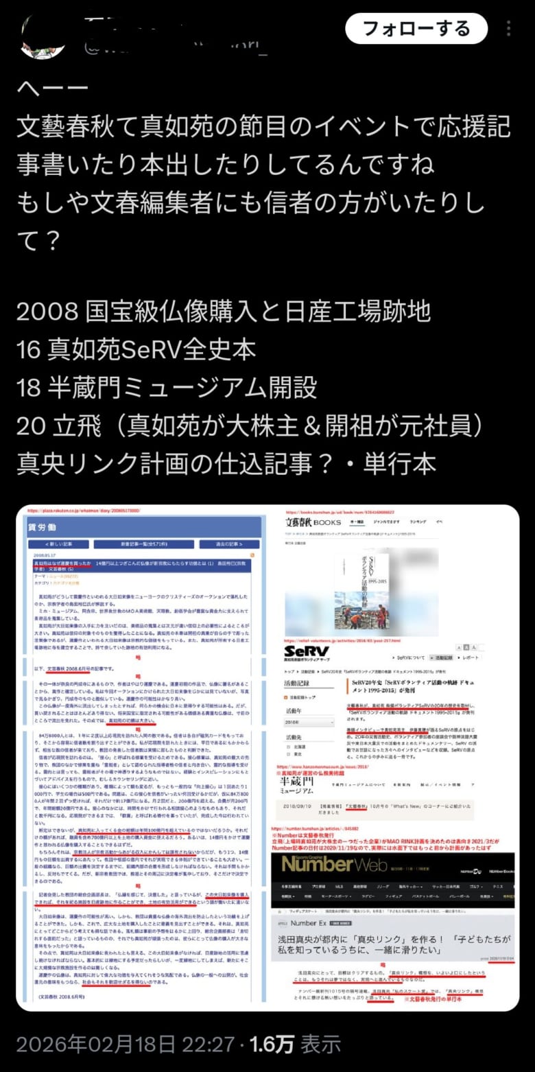 文藝春秋社の『週刊文春』や『Number』は新興宗教「真如苑」のアゲ記事をいくつも書いてる。もちろん真如苑と繋がりのある浅田のアゲ記事も異常に多い。