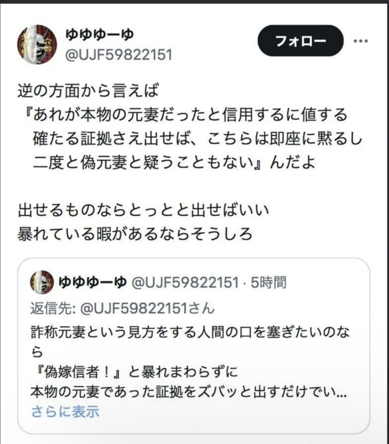 偽嫁の証拠はなんもないから本物の証拠出せと喚いてるw